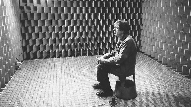 (John Cage in Harvard University’s Anechoic Chamber; photographer unknown.)
