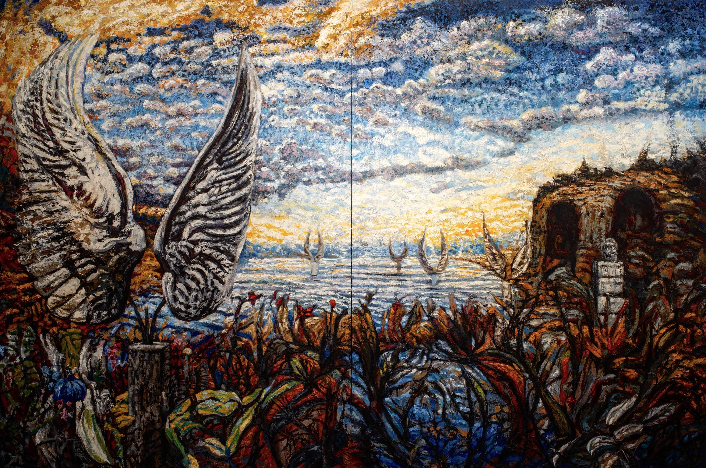(Michael Roque Collins, Floating Worlds Series: Garden of Stone Wings, oil on linen, 80 x 120 inches, 2022-23)